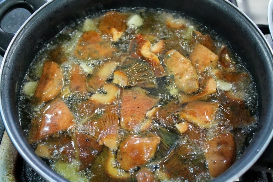 Una vez tengamos todas las setas limpias y cortadas pondremos en una sartén abundante aceite (no paséis pena por poner aceite ya que esté luego nos servirá para poner en el bote con las setas), cuando el aceite esté caliente pero sin que llegue a humear, ponemos los ajos los movemos un poco y seguidamente las setas, mejor hacerlas en distintas tandas ya que sueltan agua y bajan la temperatura del aceite, darles unas vueltas y sacarlas, no deben quedar muy cocinadas, tienen que estar al dente.