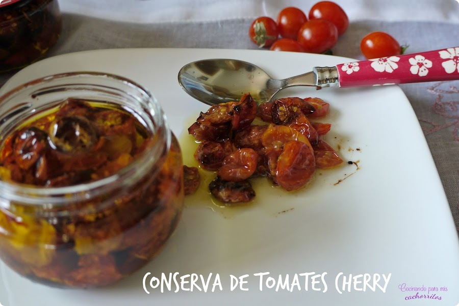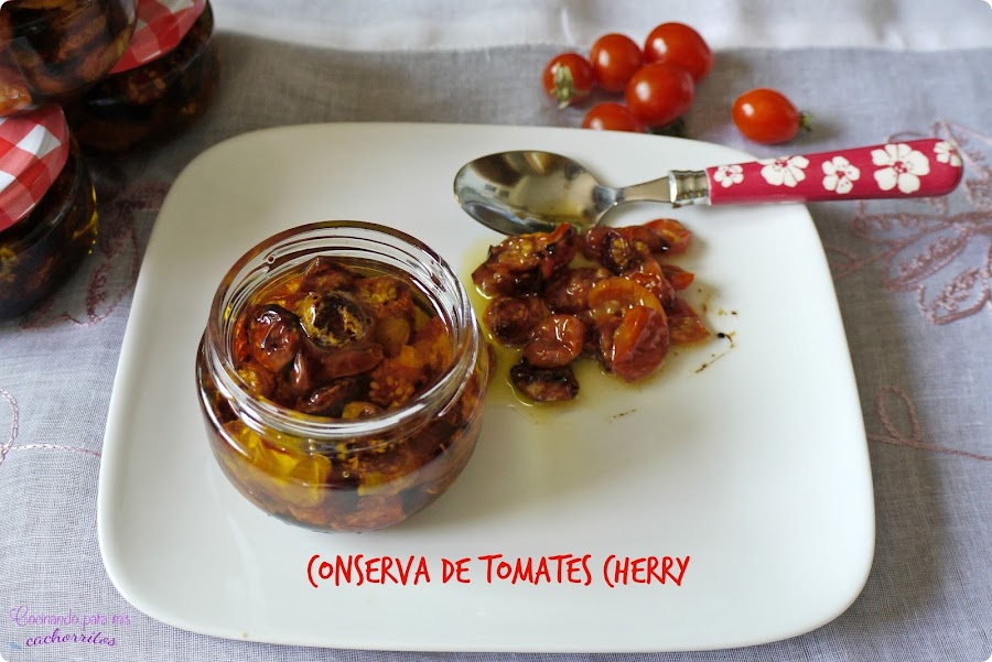 Ya se sabe lo que decía la hormiguita: en épocas de abundancia hay que guardar para el invierno. Pues eso estoy haciendo yo estos días, embotando todo lo embotable para poder consumir fuera de temporada. Y una de las maneras que he encontrado para conservar los tomates cherry es esta que os voy a contar hoy.