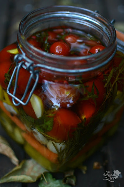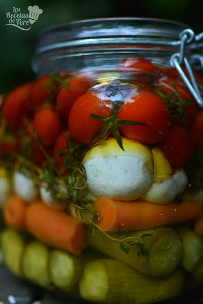 Ya es momento de envasar, corta en 2 los pepinos y las zanahorias, haces primero una cama con los pepinos, sobres estos, pones las zanahorias, sobre estas pones los champiñones y por último le agregas los tomates cherry, una vez ya hecha la presentación de los vegetales le agregas el aceite de oliva, el resto del vinagre así como todas las hiervas aromáticas, los dientes de ajo y la sal, deja macerar por al menos 3 horas y listo, una maravilla ideal para acompañar infinidad de recetas, guarda en la nevera, te dura varios días. Puedes utilizar también pimientos, coliflor, brócoli, cebollas y el aceite que queda en el envase es maravilloso para un guiso!!