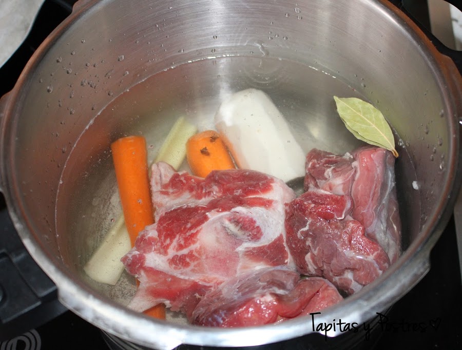 Añadimos el agua y cerramos la olla. Cocinamos. Al acabar colamos el caldo y le quitamos la espuma. Con la verdura podemos hacer un puré y con la carne croquetas. Tres en uno.