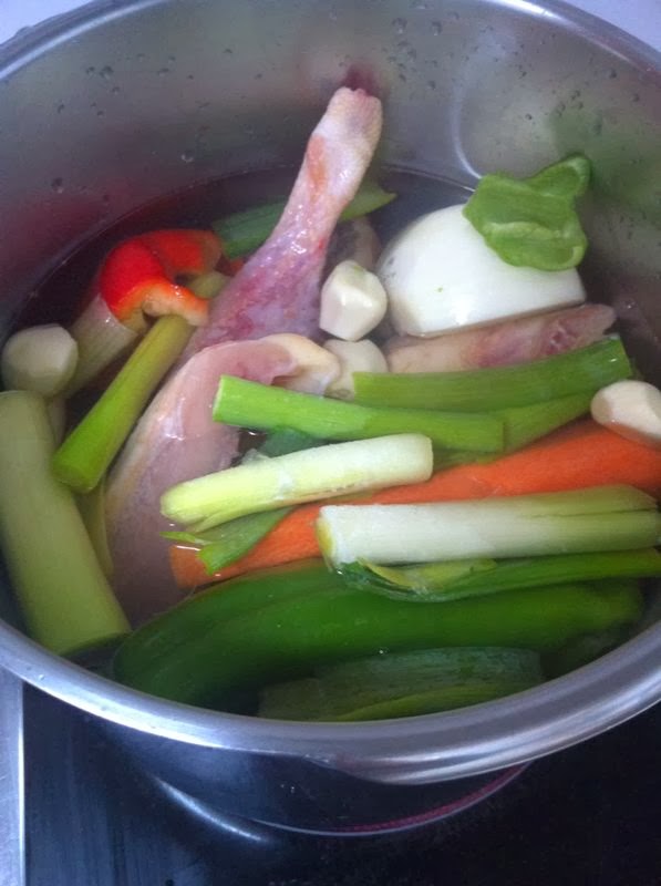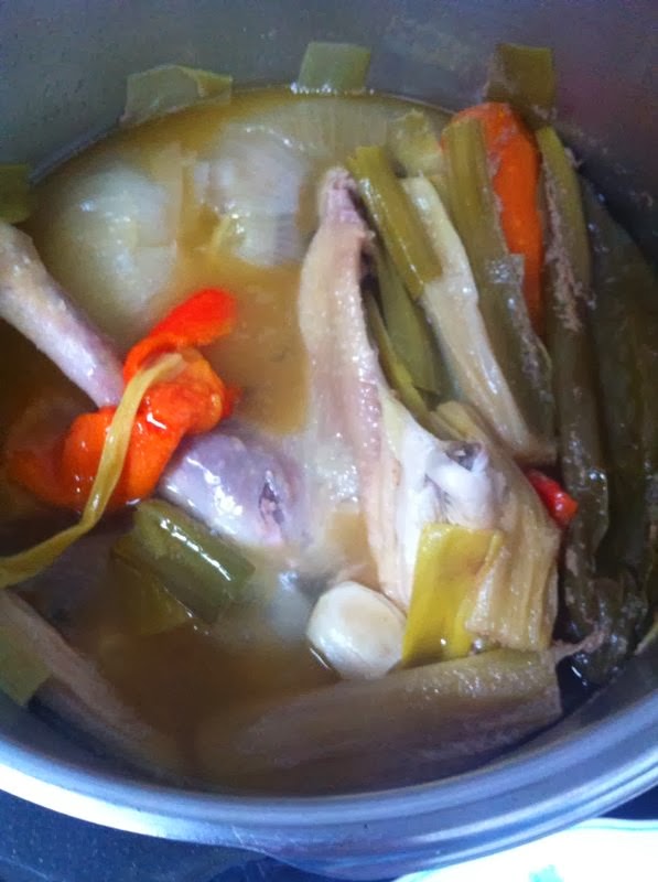 Cuando la válvula este abajo, abriremos la olla y sacaremos la gallina y el jamón, para pasar las verduras con la batidora.