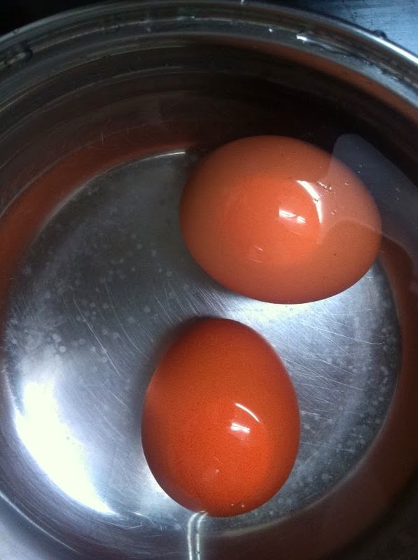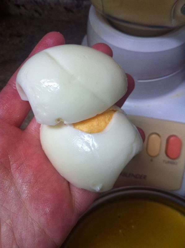 Pasados los diez minutos, pasamos los huevos por agua fría, para pelarlos mas facilmente, y los reservamos pelados para después.