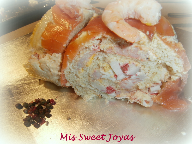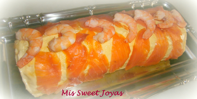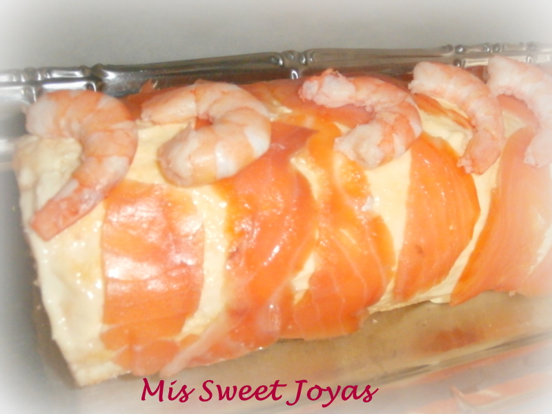 5.Untamos con mayonesa el brazo de gitano y decoramos con el salmón ahumado y las gambas que habíamos reservado.