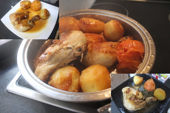 Dejamos cocerse hasta que las patatas estén tiernas y el pollo blandito, alrededor de una hora, vigilando y dando la vuelta, con cuidado de no romper las patatas, cada 15 minutos aproximadamente.