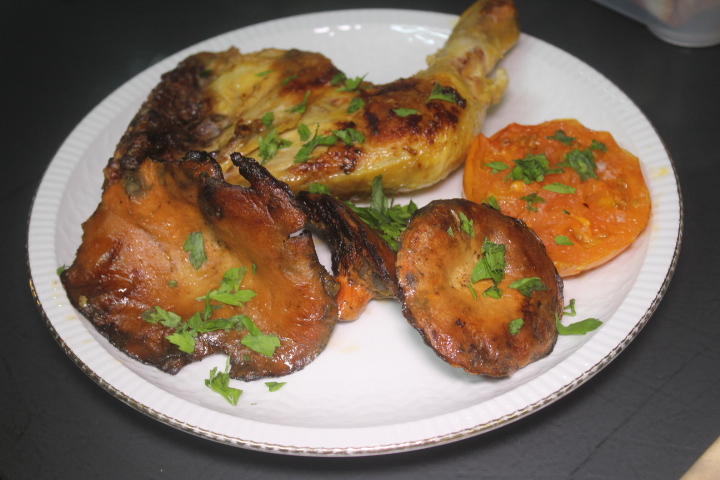 Cuando el pollo este a media cocción (serán necesarios unos 30 minutos), abrimos el grill, agregamos al grill los níscalos y los rociamos con aceite, los sazonamos, damos la vuelta al tomate, dejando el grill abierto, usándolo de plancha.