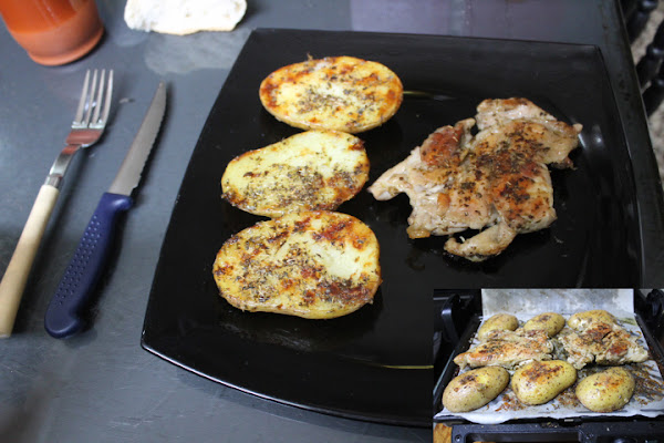 A media cocción comprobamos el estado de las patatas y los contramuslos, les damos la vuelta para que se hagan por igual y dejamos cocinarse hasta que estén tiernas al pincharse las patatas y el pollo cocinado.