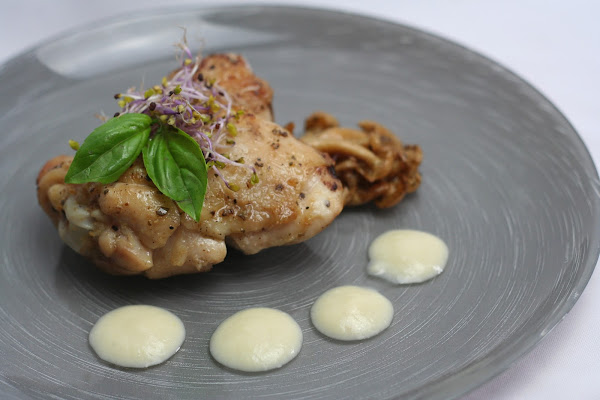 Mientras se asa el pollo prepararemos la salsa y las setas. Para la salsa, troceamos la cebolla finamente y cortamos el diente de ajo en láminas. Troceamos los calabacines en cuadraditos. En una cacerola con un chorrito de aceite, ponemos a pochar la cebolla y el ajo con una pizca de sal. Cuando empiece a transparentarse la cebolla añadimos un chorrito de vino blanco y una vez que se haya evaporado añadimos los calabacines. Removemos bien y añadimos la sal, la pimienta, la nuez moscada y la rama de albahaca. Dejamos cocinar todo junto unos 5 minutos removiendo de vez en cuando. Pasado ese tiempo añadimos un poco de agua y un chorrito de leche evaporada (no queremos que quede muy líquido, así que echad poco líquido). Dejamos cocer a fuego medio-bajo hasta que el calabacín esté blandito. En ese momento, retiramos la rama de albahaca y trituramos bien hasta conseguir una salsa suave. Reservamos.