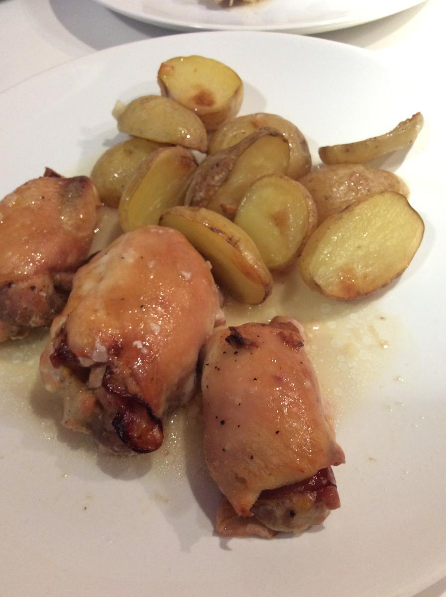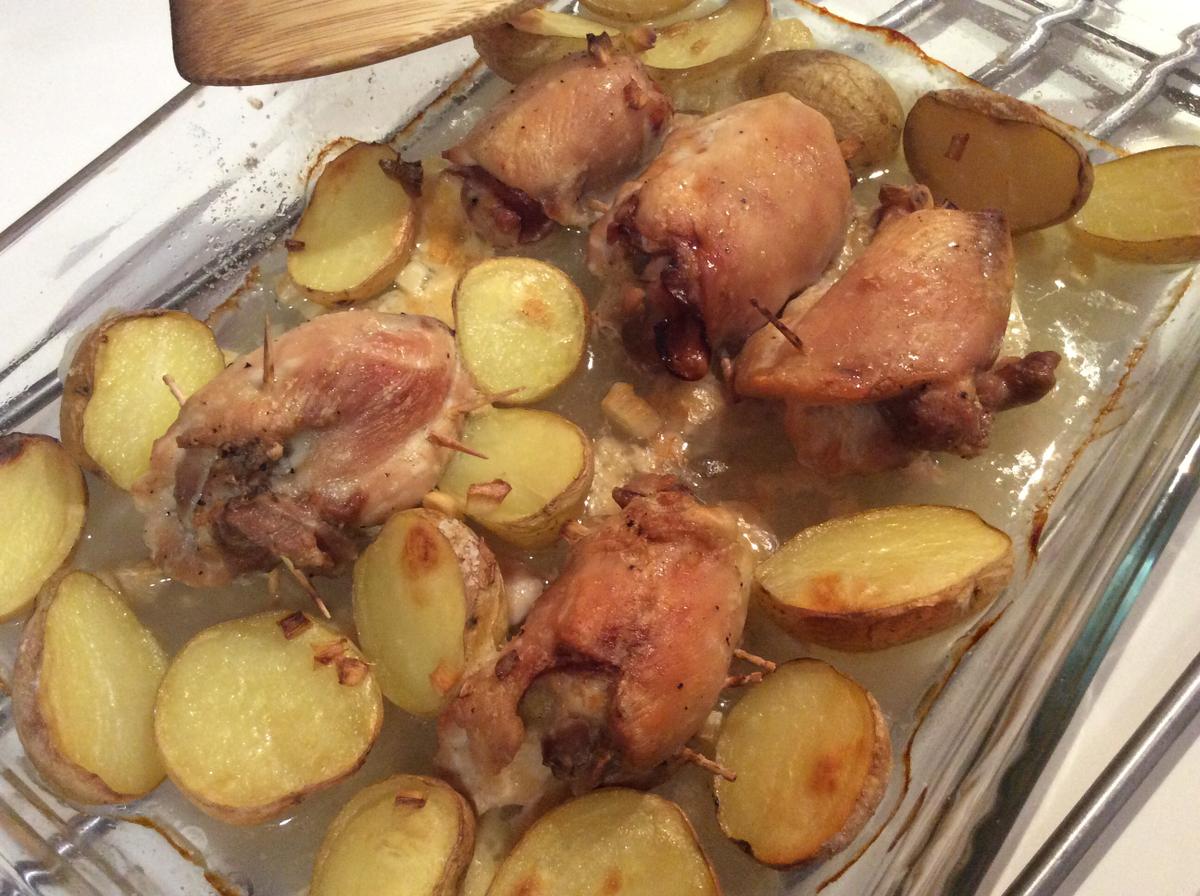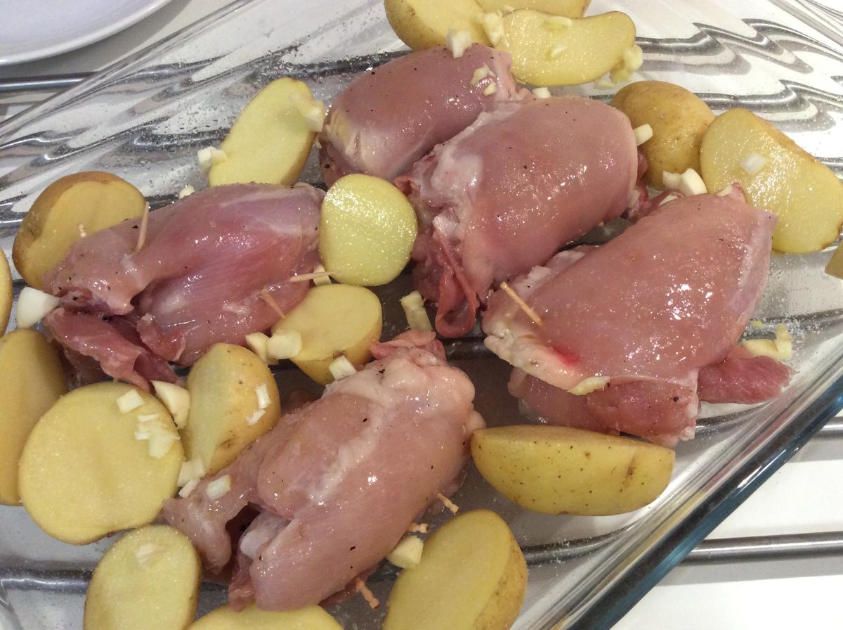 Los ponemos en la bandeja junto a las patatas y picamos el ajo por encima.