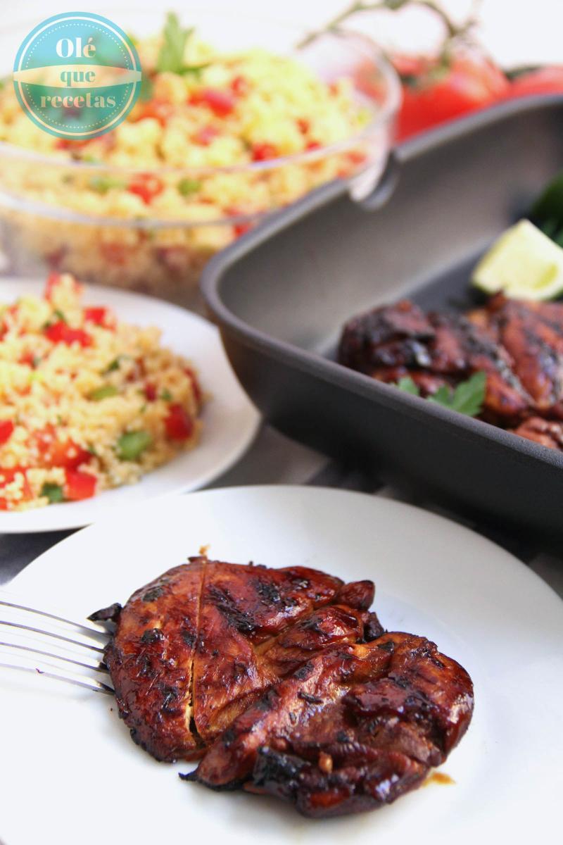 Nos gusta mucho las carnes en adobo. Salen muy jugosas y sabrosas. Se pueden preparar adobos diferentes: con miel, con mostaza, con pimentón dulce, con vino blanco, con vino tinto…Hoy os enseñamos como hemos preparado unos contramuslos de pollo en adobo ácido-dulce. Primero hay que comprar unos contramuslos de pollo sin hueso y sin piel, en filetes bastante gordos. La carne tiene que ser fresca. Mejor no usar carne congelada ya que al descongelarse sale mucha agua. Lo mejor es dejar la carne en adobo durante 24 horas y en la nevera, pero en el caso del pollo, entre 5 y 12 horas es suficiente. Podéis comer los contramuslos de pollo en adobo ácido- dulce por ejemplo con una ensalada de cuscús.