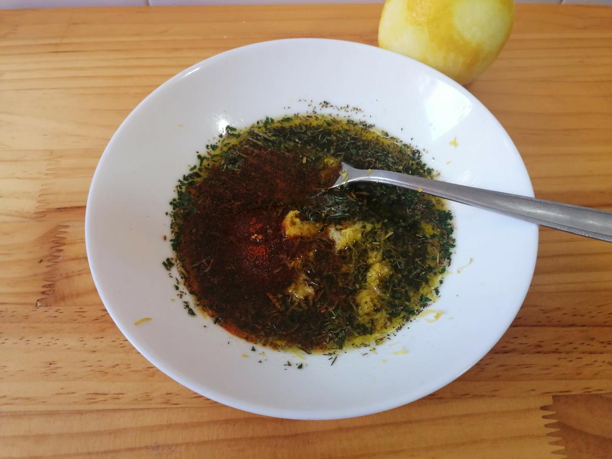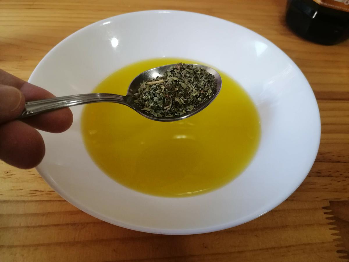 En un plato hondo baña el fondo de aceite de oliva virgen extra y añade una cucharada sopera de las especias que más te gusten. Usa frescas si tienes, pero si no puedes usar perfectamente las secas de bote.Vete mezclándolo todo bien con un tenedor, machada la salsa bien, ¿notas el olor? qué rico!