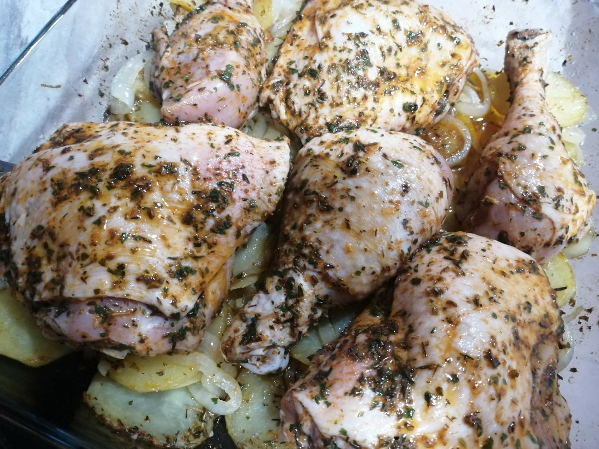 Pelamos unas patatas y cebolla y las vamos haciendo. Ahora sí que usamos sal, tanto aquí como en el pollo. Puedes darlas un toque en la sartén primero y luego meterlas en el horno durante media hora con algo de aceite, puedes echar también un toque de brandy que le irá muy bien. Después añadiremos el pollo con el líquido del marinado y lo haremos media hora por un lado y media hora por el otro a 180º.