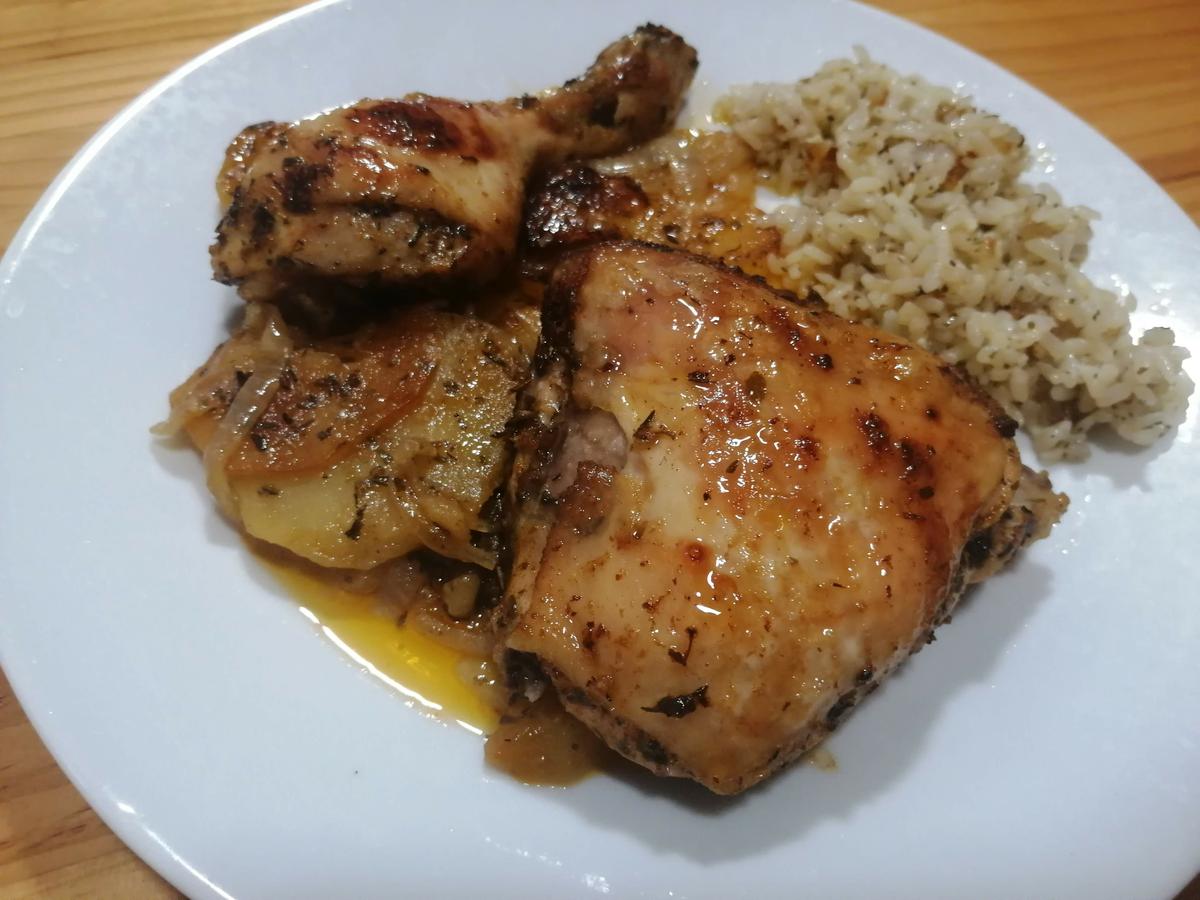 Finalmente haremos unas patatas y cebolla al horno junto al pollo, un poco de arroz y tendremos nuestro plato listo para degustar. Si tuvieras una parrilla sería una opción estupenda!