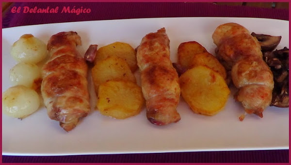 Mientras preparamos los contramuslos, en mi caso he utilizado contramuslos deshuesados. Para rellenarlos únicamente he puesto unos cuantos champiñones troceados y piñones, los he cerrado y atado para que no pierdan la forma, y los he salpimentado.