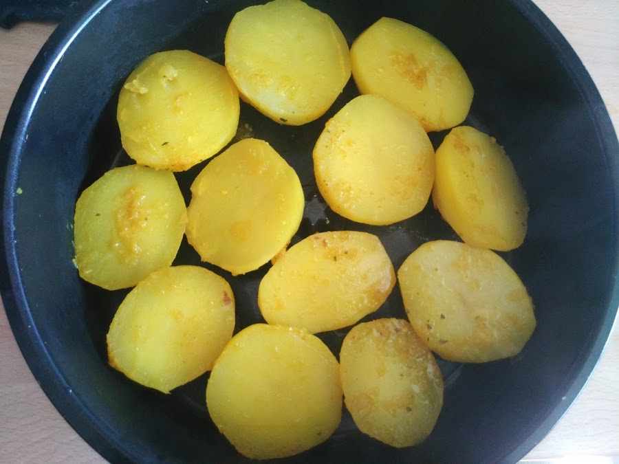 Pelamos y lavamos las patatas, las cortamos a la mitad a lo largo, salamos y las colocamos en la cubeta junto con el pollo.