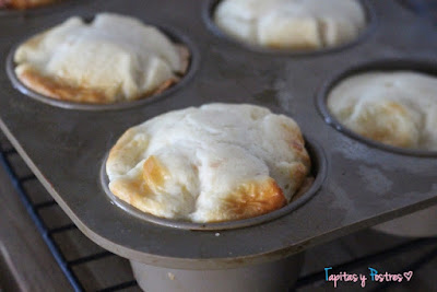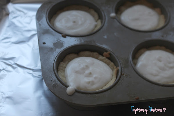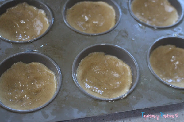 En un molde de muffins que engrasamos ponemos masa formando como una "cesta". Mi fallo fue dejar una capa algo gruesa, mejor una capita más fina pues así cabe más relleno. Por cierto, el molde está feo del uso, pero está limpito jejeje. Reservamos en el congelador mientras seguimos con la receta. Se me olvidaba deciros que es una masa pegajosa, untaros un poco de aceite para manipularla.