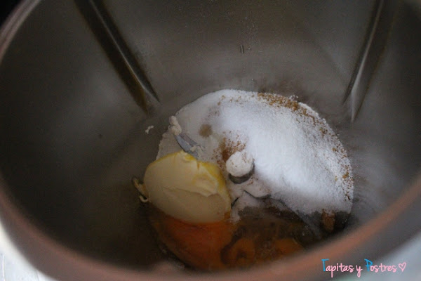Empezamos con la parte cookie. Ponemos en el vaso de la thermomix o de una batidora los ingredientes de la masa: harina, las dos clases de azúcar, huevo, mantequilla y bicarbonato. Lo mezclamos diez segundos a velocidad 6.