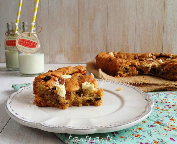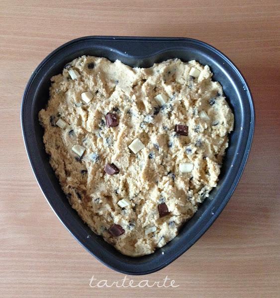 Engrasamos el molde, rellenamos el molde con la masa y ponemos la mitad de los trocitos de los dos chocolates donde mas os guste.