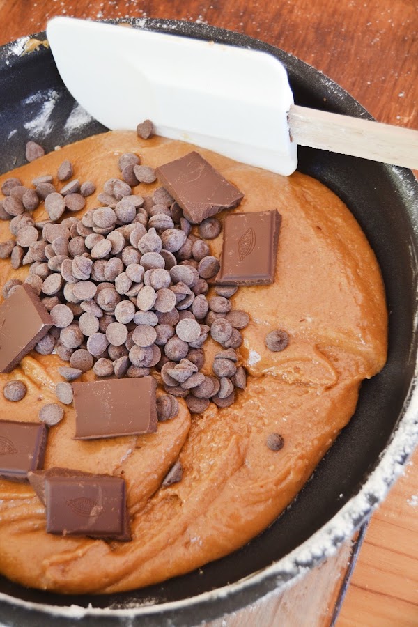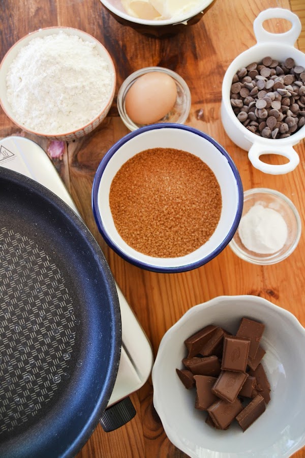 Calentamos la mantequilla en la sartén a fuego medio. Derretimos la mantequilla por completo y retiramos la sartén del fuego. Añade el azúcar y el huevo. Remueve todo muy bien hasta conseguir una mezcla homogénea. Tamizamos la harina junto con la levadura y la añadimos a la mezcla. Removemos muy bien. Agregamos el chocolate (no lo añadas todo, para poder decorar un poco por encima). Remueve todo muy bien hasta integrar el chocolate. Agrega la masa a la sartén y extiende la masa por toda la sartén con la ayuda de una espátula. Agrega los trozos de chocolate que nos reservamos anteriormente por encima.
