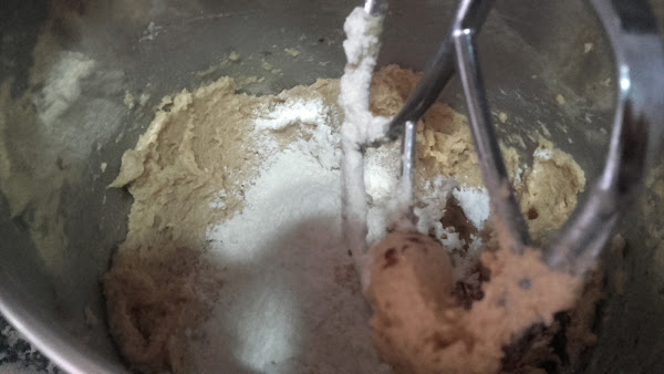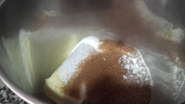 En un bol echamos la mantequilla y los azucares y mezclamos ( Si no tienes batidora se puede mezclar con las manos,cuchara. La receta también te saldrá perfecta así.)