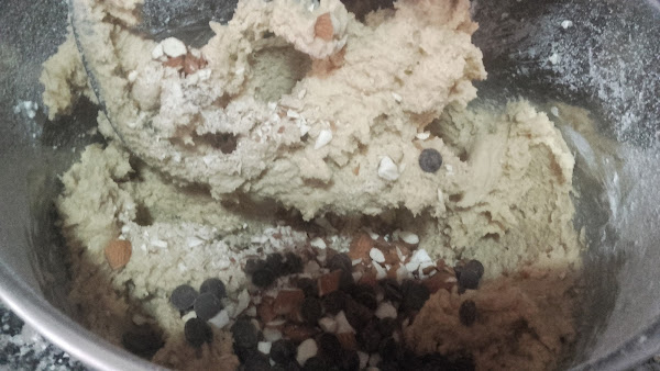 Ahora echamos las almendras y el chocolate ( apartamos un poco de gotas de chocolate para decorar las cookies)