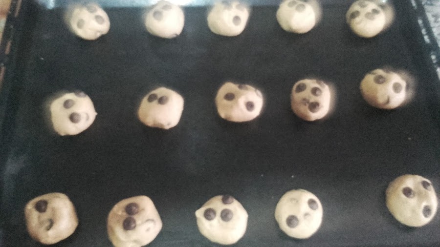 Hacemos bolitas pequeñas y decoramos las cookies con las gotas de chocolates que hemos apartado.