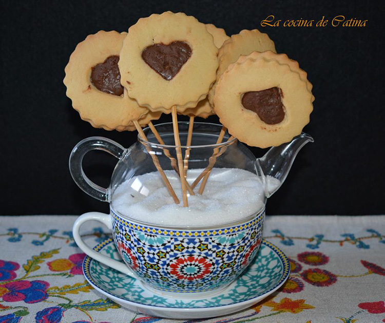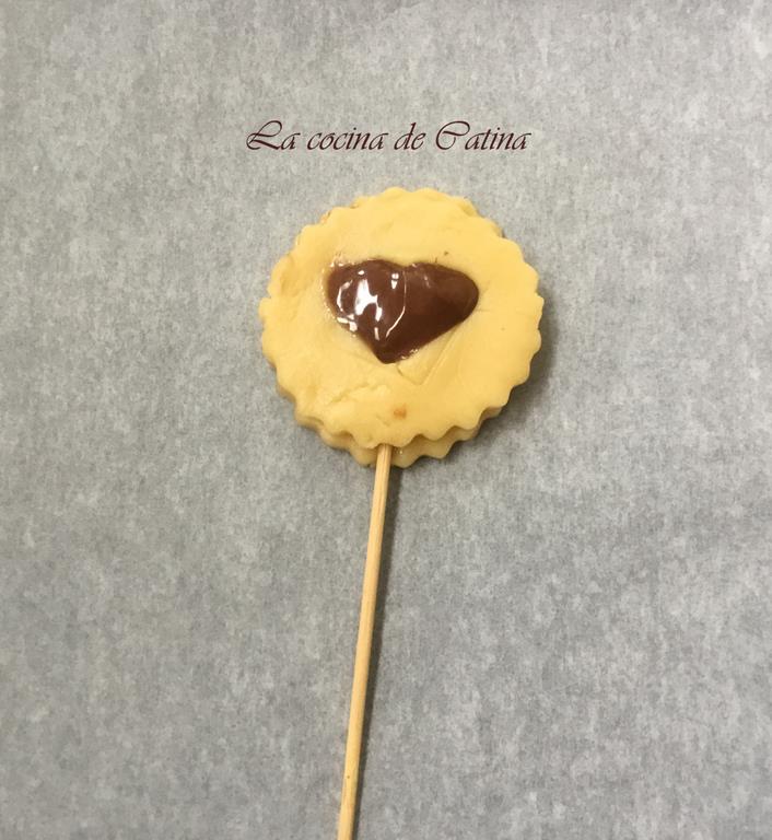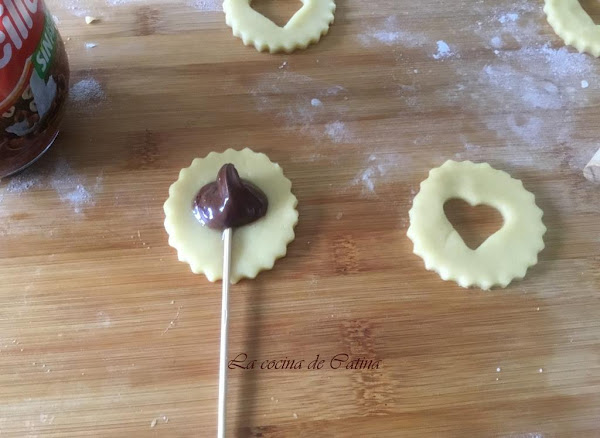 Colocamos la otra mitad de las galletas sobre la bandeja recubierta separadas entre sí unas de otras, le colocamos a cada una un palito de chupa-chus o de brocheta, y presionamos un poco para que se hunda en la masa, ponemos en el centro una cucharadita de Nocilla y recubrimos cada una de ellas con una de las galletas a las que le hemos sacado el corazón.