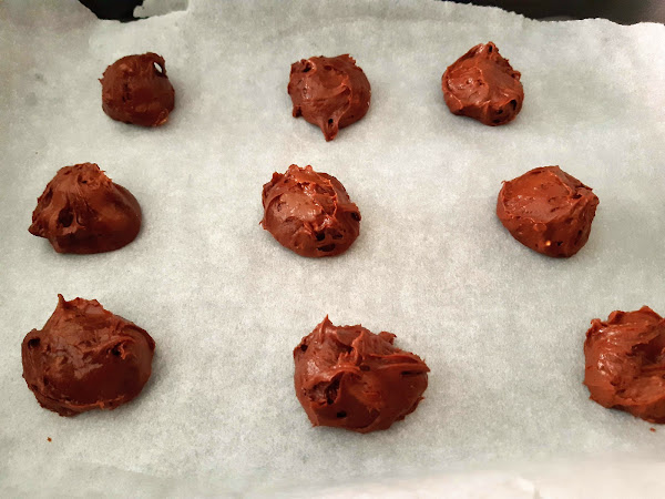 Con 2 cucharas, o con una cuchara para helado, saca porciones y ponla sobre papel de horno, si quieres puedes espolvorear el papel con aerosol antiadherente. El tamaño es como de una pelota de ping pong.
