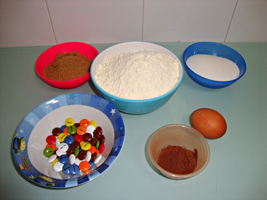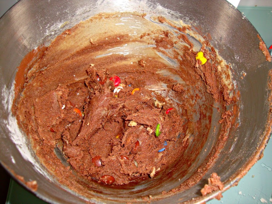 Luego añadimos la mezcla de harina poco a poco, vemos que se va quedando cada vez mas densa, y finalmente cuando esta bien integrada añadimos los Lacasitos.