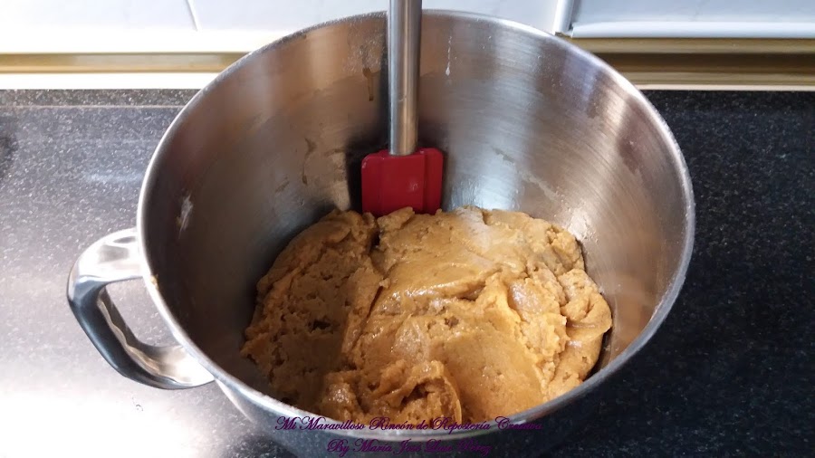Ahora tamizamos con un colador las harinas y las añadimos a la mezcla que tenemos. Batimos lo necesario, es decir, hasta que integremos las harinas. Procuraremos no sobre batir la masa, porque si no las galletas saldrán duras. Debemos conseguir una masa que se despegue de las paredes del bol, blandita y moldeable, con la textura que vemos en la foto de abajo.