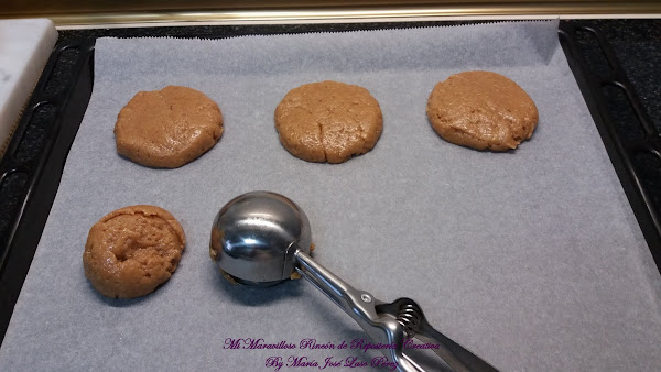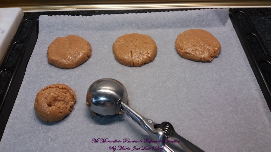 Forramos una bandeja con papel de horno. Con una cuchara de helado, vamos haciendo bolas de masa que iremos colocando sobre el papel.