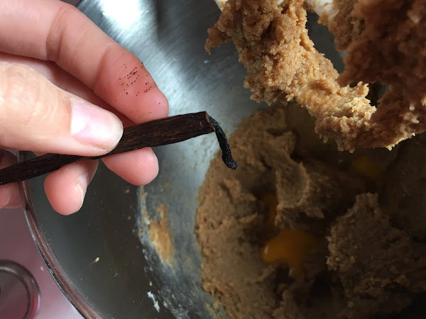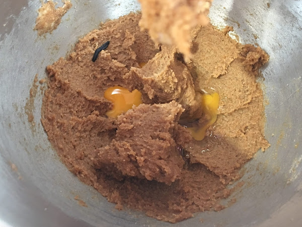 2. Añadimos el huevo a la crema y seguimos batiendo a velocidad baja. También incorporamos la media vaina de vainilla natural.