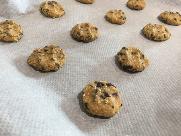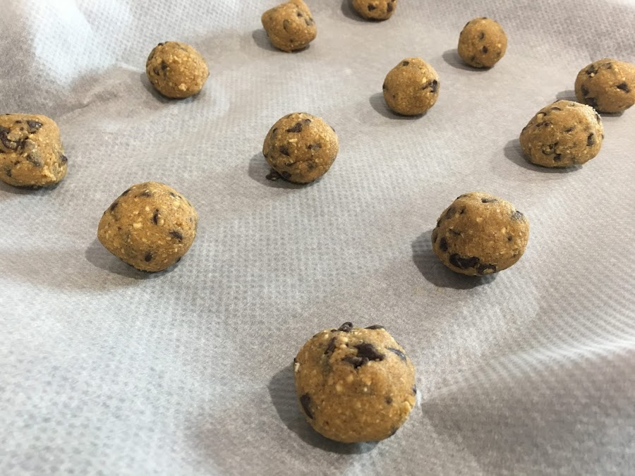 5. Precalentamos el horno a 190ºC arriba y abajo. Cubrimos la bandeja de horno con papel. Cogemos porciones de masa, yo las hago de 20g aproximadamente. Boleamos con las manos un poquito, y distribuimos en la bandeja. Os cogen unas 12-16 galletas.
