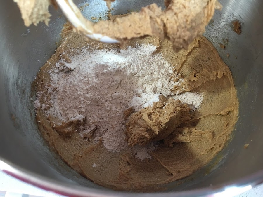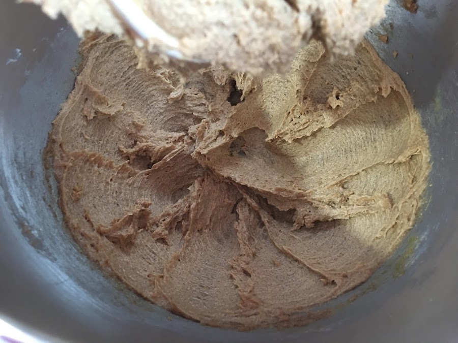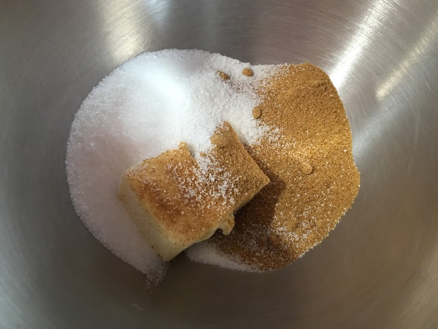 1. En un bol mezclamos la mantequilla, que debe estar en punto pomada con el azúcar moscovado y el azúcar blanco. Batimos a velocidad media hasta que se forme una crema densa.