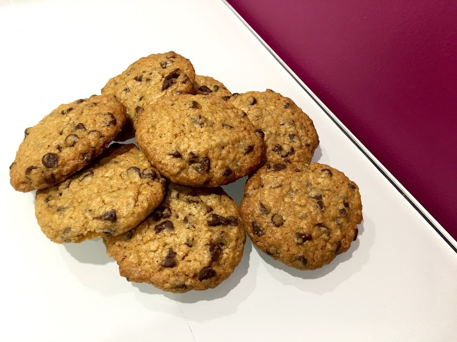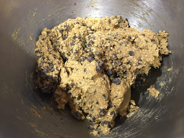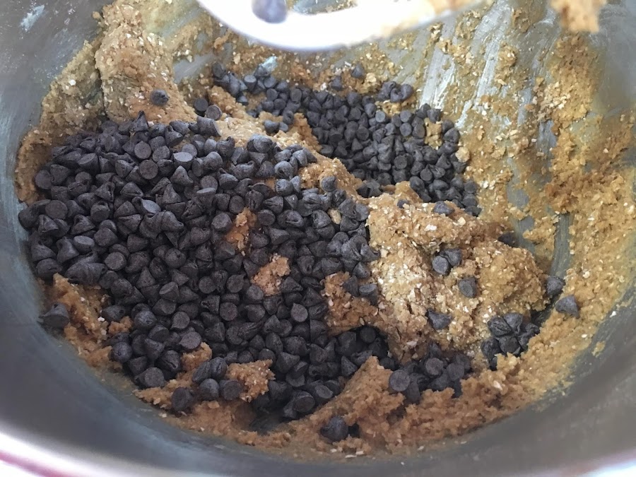 4. Por último añadimos las gotitas de chocolate negro. Mezclamos ligeramente y ya tenemos nuestra masa de galletas lista.