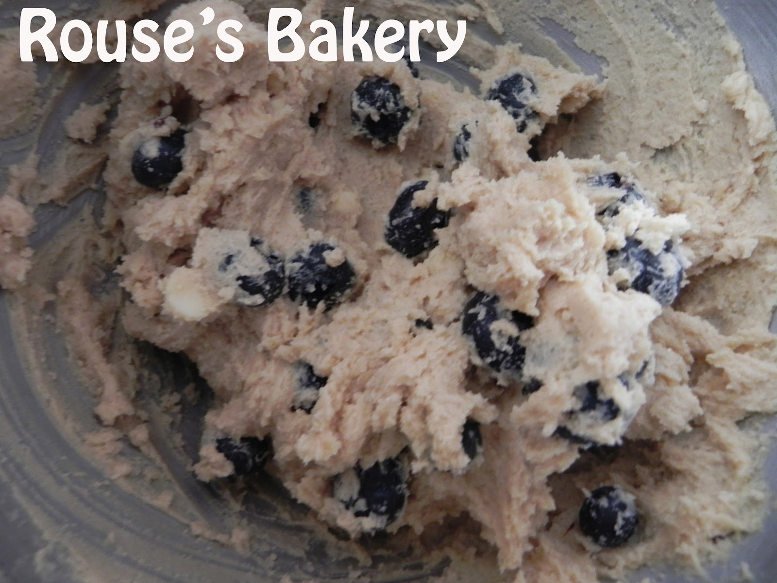 Añadimos las pepitas de chocolate y las incorporamos. Lavamos y secamos los arándanos y los añadimos a la mezcla. Aqui es mejor mezclar con cuchara o lengua de silicona para evitar que los arándanos se rompan.