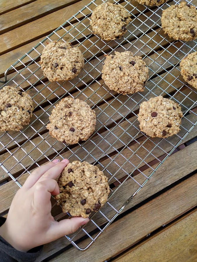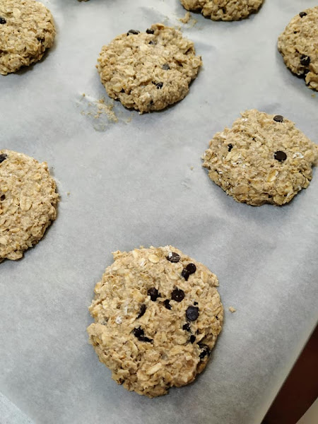 Preparamos una bandeja de horno con papel vegetal, con ayuda de una cuchara (yo uso la de hacer helados) hacemos bolitas y las ponemos sobre la bandeja, aplastamos con la mano para darle forma de galleta.