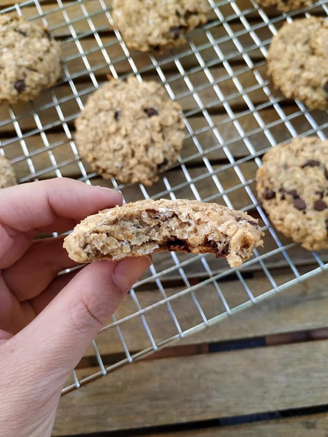Encendemos el horno a 180ºº con calor arriba y abajo, en un bol mezclamos los copos de avena y la harina, añadimos la bebida vegetal de avena y el aceite, en un plato aplastamos el plátano con un tenedor hasta que se haga puré y mezclamos con el resto de ingredientes, por último agregamos los chocolate drops.