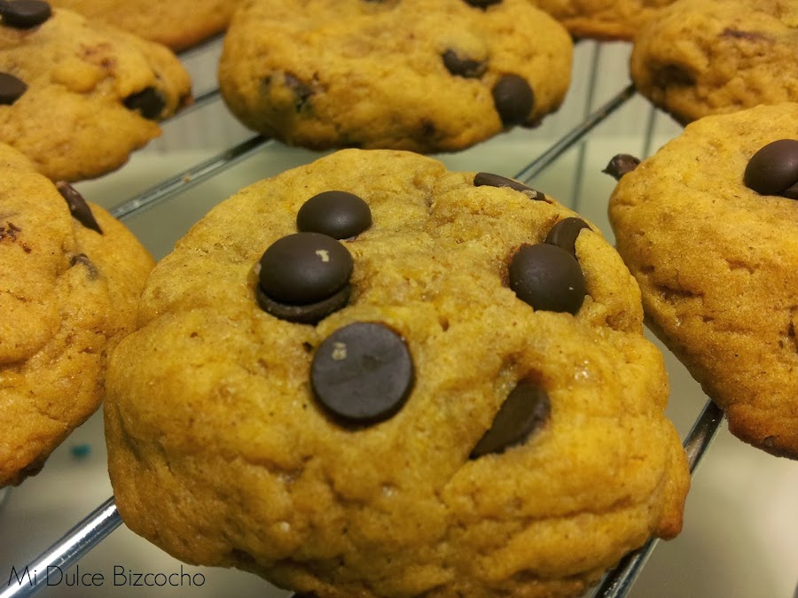 Son unas galletas suaves y especiadas. Son parecidas a las chocolate chips cookies, pero al llevar la calabaza, no llegan a ser crujientes, pero tampoco son blandas, están en el punto medio perfecto. Como llevan canela y nuez moscada tienen un sabor muy especial. Si os gustan las especias, os encantarán estas galletas de calabaza con chips de chocolate.