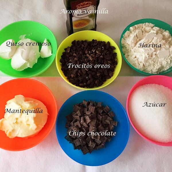 Mezclamos la mantequilla y el queso con unas varillas, si son eléctricas mucho mejor, por eso del dolor de brazo. La añadimos el azúcar y la vainilla y mezclar hasta que estén bien integrados. Ponemos la harina y cuando esté bien mezclada le ponemos las chips de chocolate.