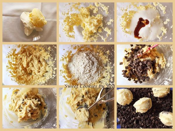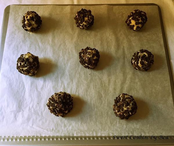 Hacer unas bolitas, yo he usado una cuchara de helados para que fueran iguales, y rodamos por las migas de oreo.