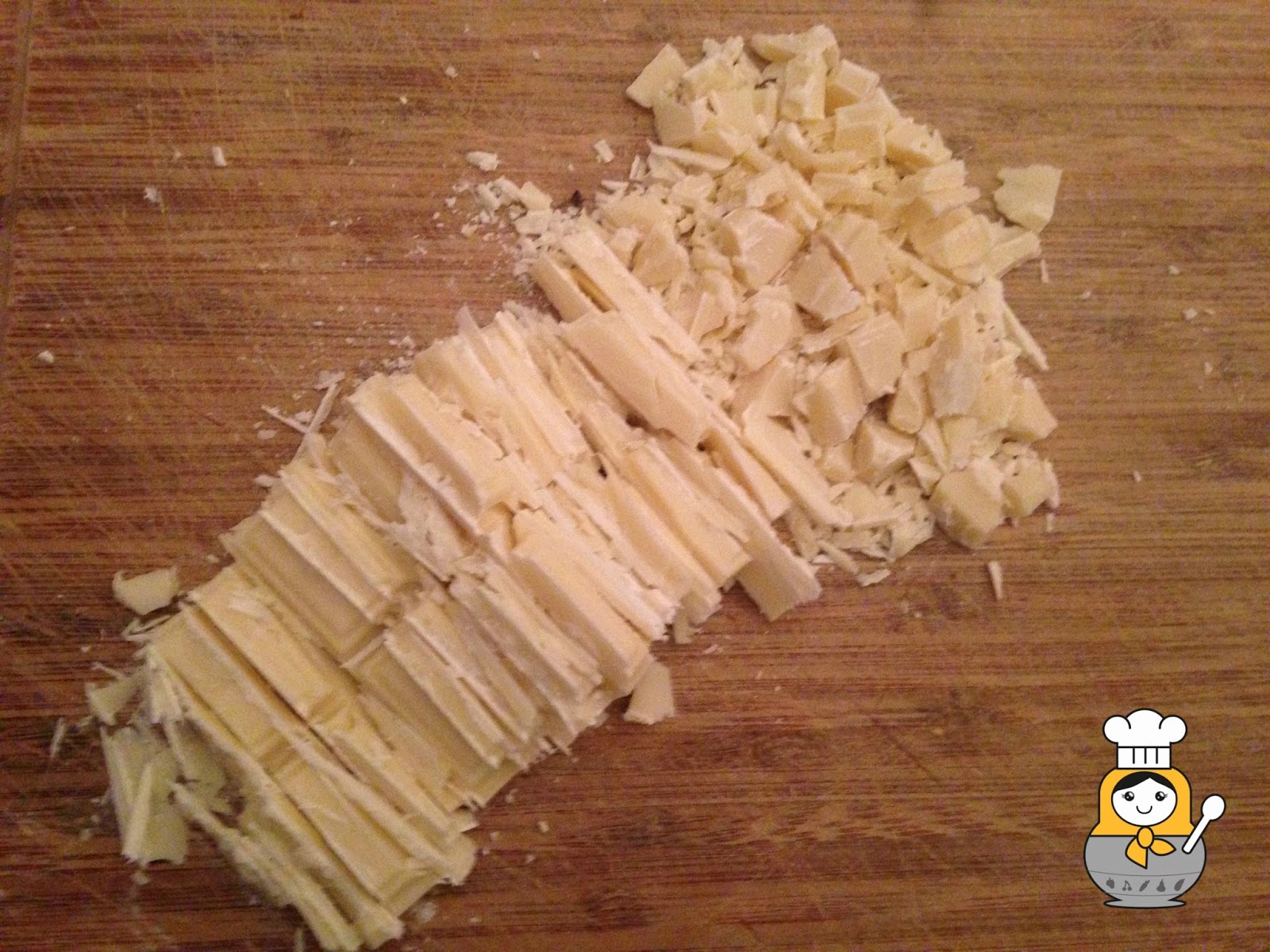 Picamos el choocltae blanco en trocitos más o menos pequeños. A nosotras nos gusta que se noten en la galleta y que sean irregulares para que les den un toque más casero.