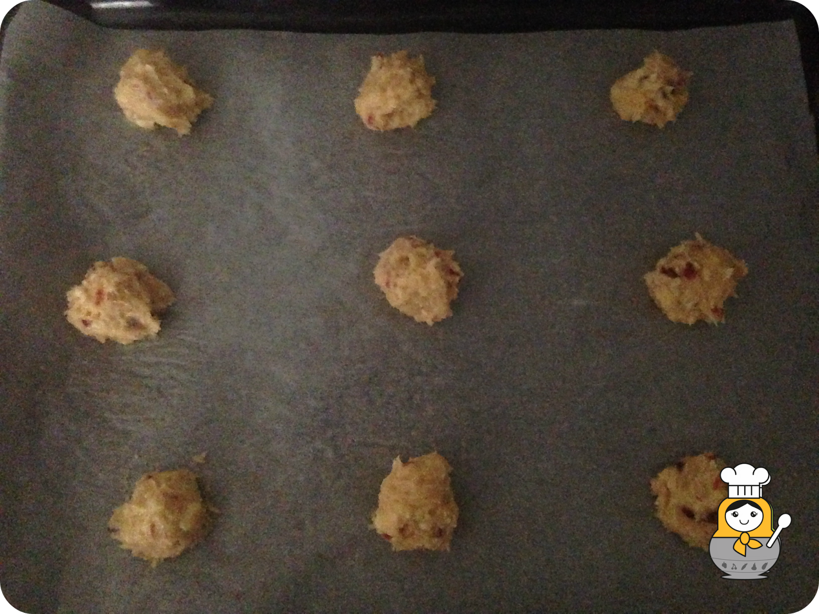 Ahora que la masa ya ha reposado, vamos cogiendo con una cuchara pequeñas porciones de masa y formamos una especie de bolas, que iremos colocando en la placa del horno cubierta con papel sulfurado. Aseguraos de dejar distancia suficiente entre unas galletas y otras porque durante la cocción se derretirán y ocuparán bastante espacio.