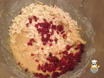 Añadimos el chocolate blanco picado y los arándanos a la masa y removemos con ayuda de una espátula para repartir todo uniformemente. Formamos una bola de masa y la cubrimos con papel film. Dejamos reposar la masa un par de horas en la nevera, o si lo preferimos por cuestiones de agenda, incluso toda la noche.