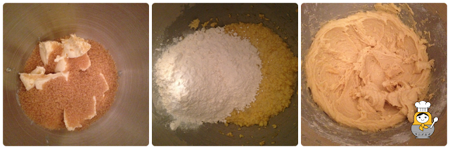 Ponemos en un bol la mantequilla a temperatura ambiente cortada en dados junto con el azúcar blanco y el moreno y batimos bien con unas varillas eléctricas hasta obtener una crema. Añadimos el huevo y volvemos a batir bien. Agregamos la harina, la sal y la levadura en polvo y mezclamos todo, siempre con ayuda de la batidora, hasta obtener una masa homogénea y lisa.
