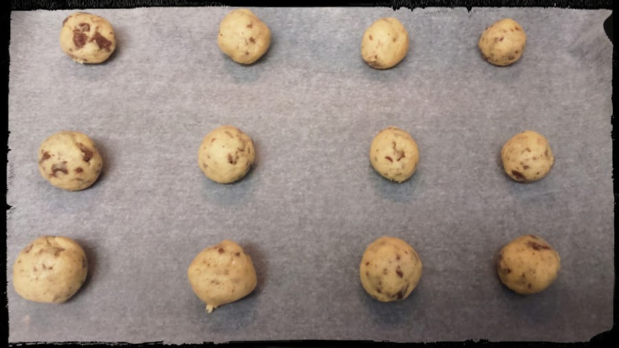 Ponemos papel de horno o una lámina de silicona en la bandeja del horno vamos haciendo bolitas del tamaño de una nuez, las galletas crecerán bastante, si queréis añadirle como hemos hecho nosotros algún lacasito, lo hundís un poco en la bolita y ya está..