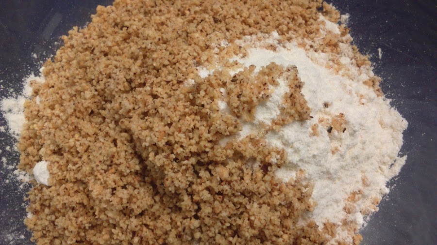 Picamos bien las avellanas, en una fuente mezclamos la harina, la sal, la levadura y las avellanas picadas, removemos bien manualmente.. La tableta de chocolate la partimos con un cuchillo en trocitos, yo hago líneas y voy cortando, me gusta mas que usar gotas o chispas de chocolate.. reservamos..