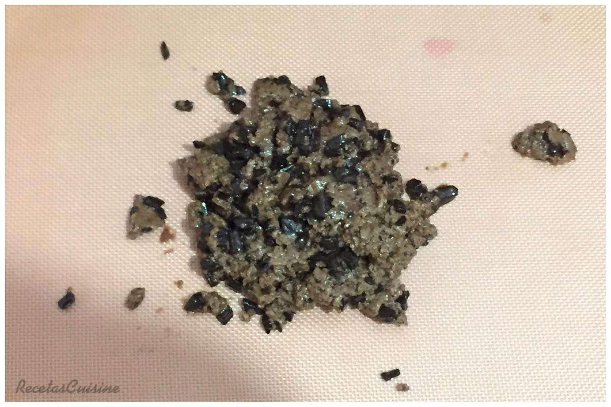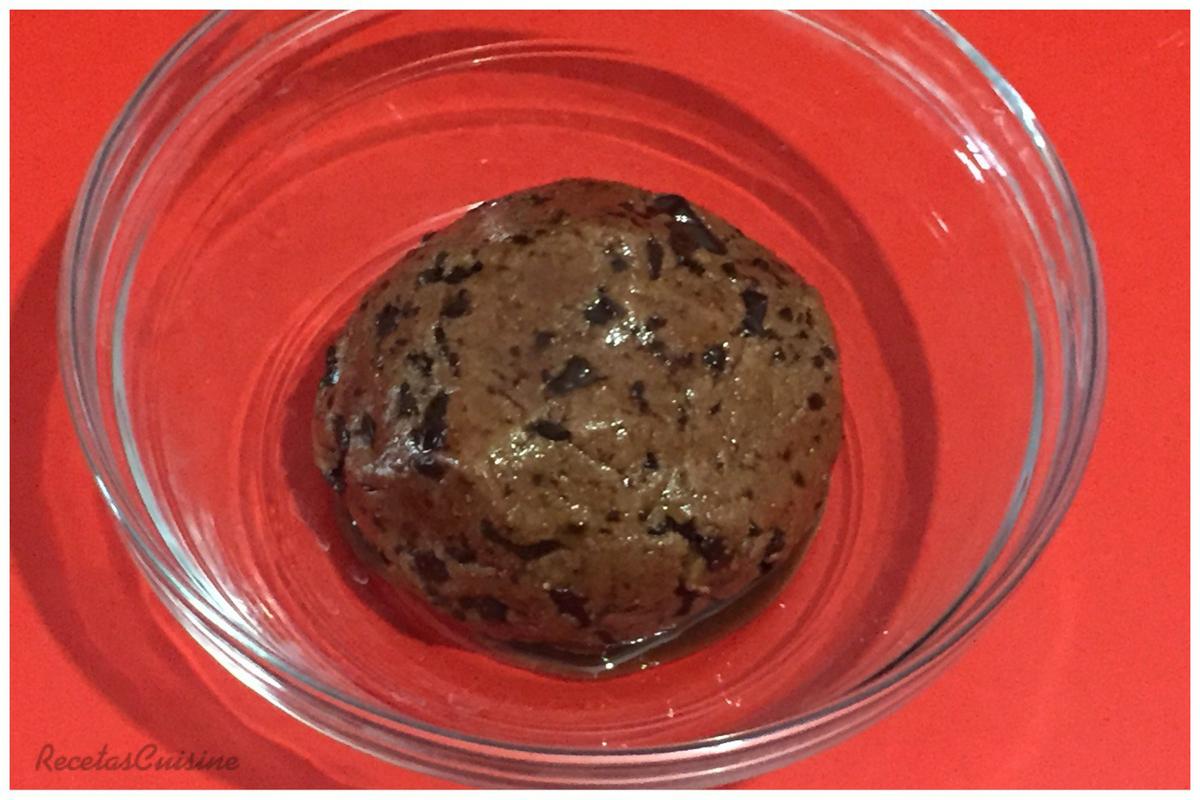 7. Sacamos del bol y terminamos de integrar a mano, dejando la mezcla hecha una bola. Ponemos en un recipiente, tapamos y dejamos reposar en la nevera durante una hora para que la masa tome cuerpo, se endurezca, y podamos manejarla para hacer las cookies.