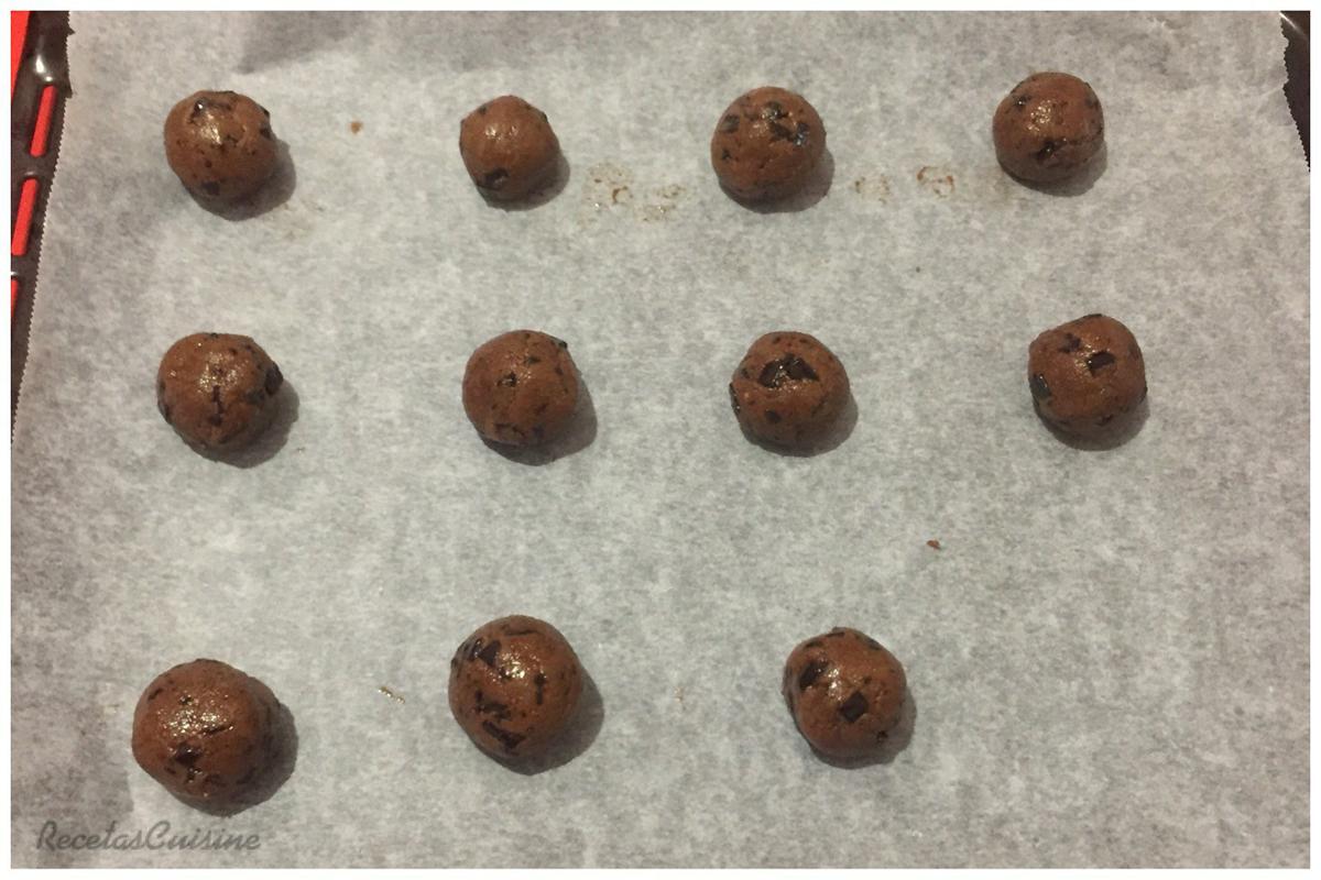8. Pasado este tiempo de reposo, boleamos pequeñas porciones de masa y las colocamos en la bandeja del horno, sobre papel de hornear, dejando espacio entre ellas para que no se peguen durante la cocción, puesto que la masa tenderá a expandirse.
