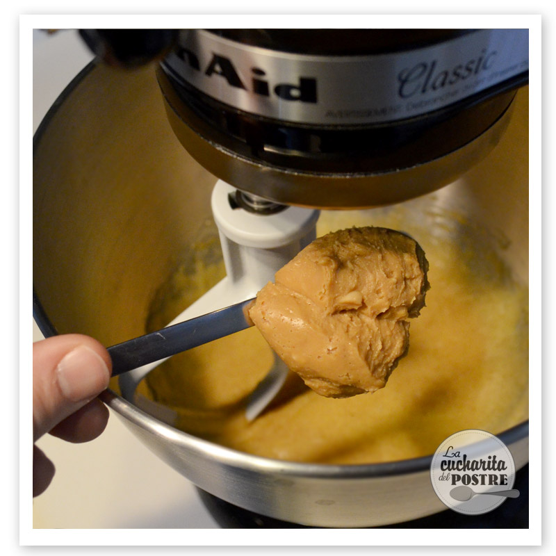 4. Agrega la mantequilla de cacahuete. Puedes poner la cantidad que prefieras y del tipo de mantequilla que más te guste. Yo puse tres cucharaditas de mantequilla con trocitos de cacahuete, que le da a las galletas un toque súper crujiente.