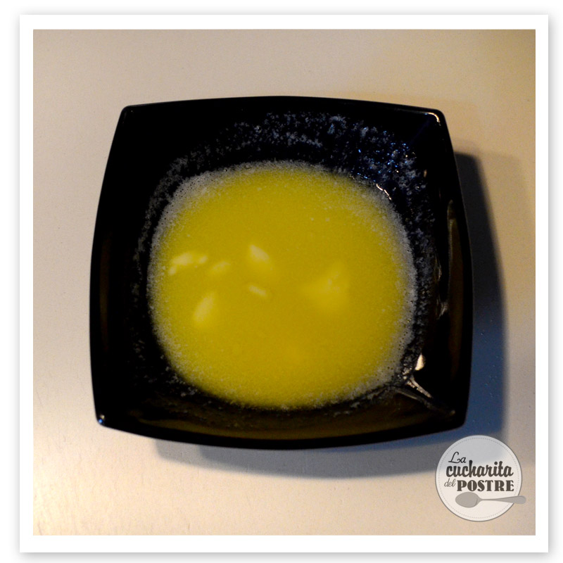 2. Mezcla en el bol de la batidora la mantequilla fundida, el huevo, los dos tipos de azúcar y la cucharadita de vainilla.